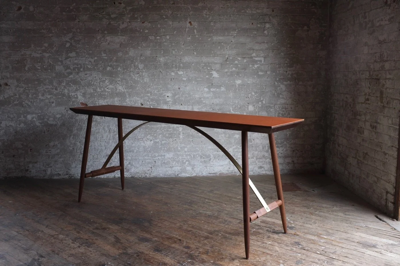 A stately brass bow arches under the top, delightfully bridging the turned leg assemblies. Available with a laminated Bridle leather top or Solid wood top with exposed through tenon joinery.