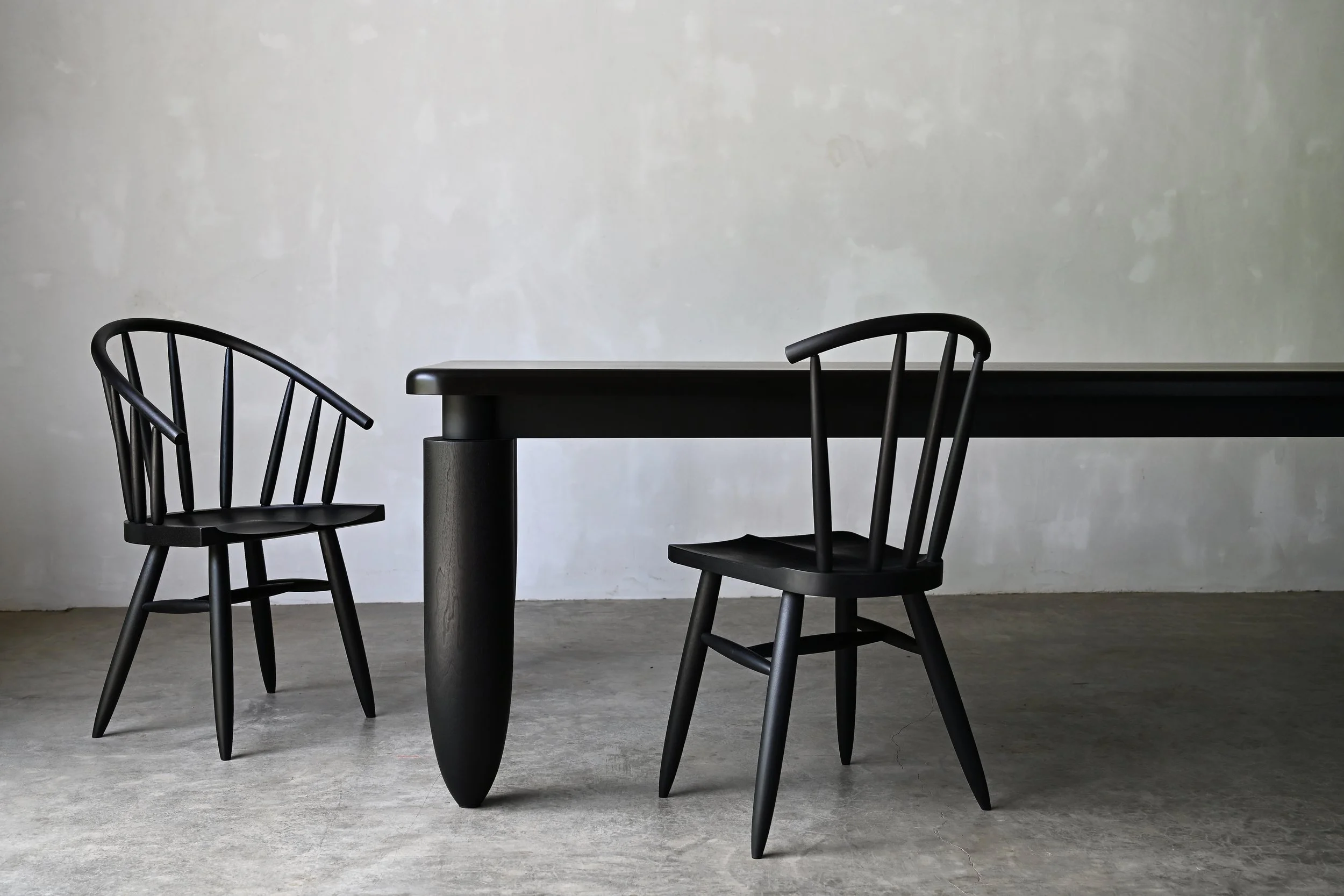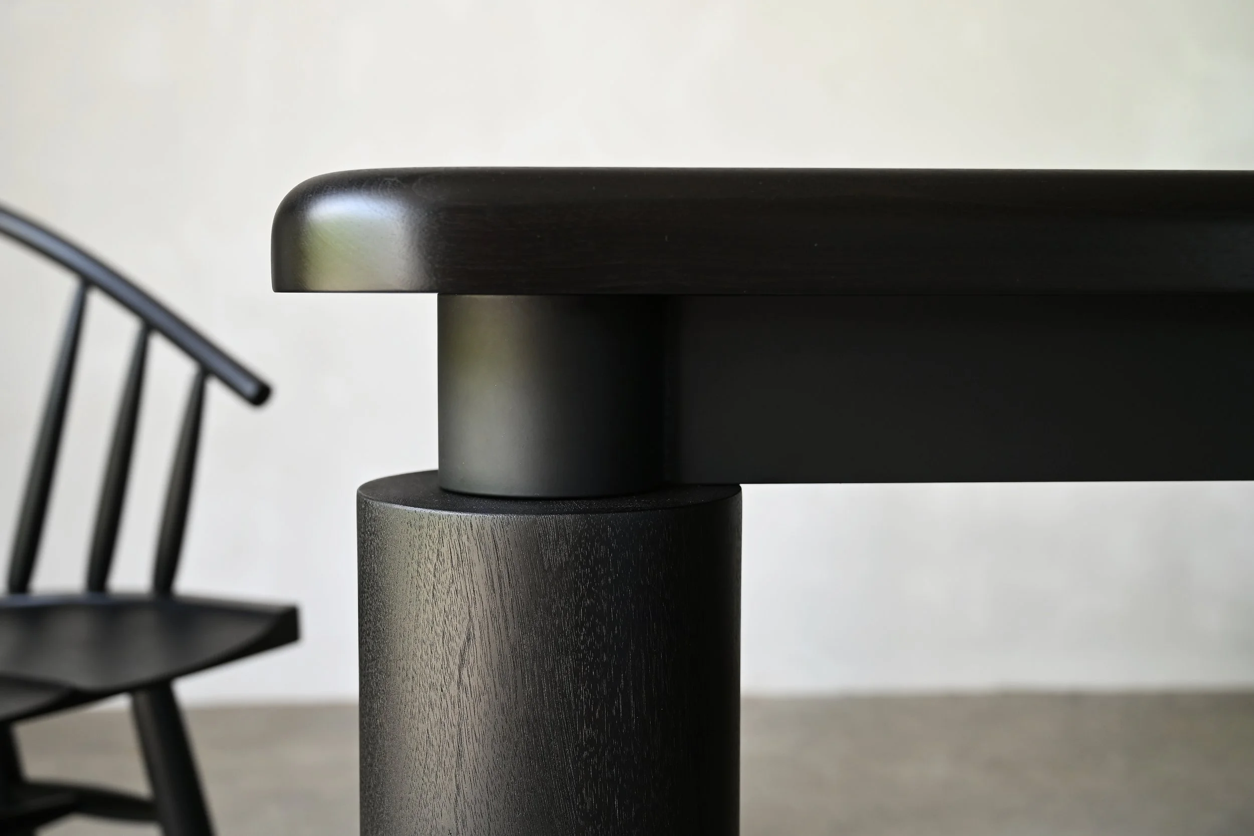 Massive solid wood torpedo legs join into blackened steel apron cuffs, creating an airy openness to the table span.