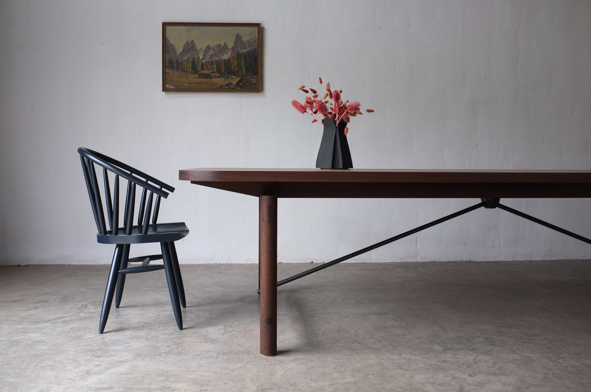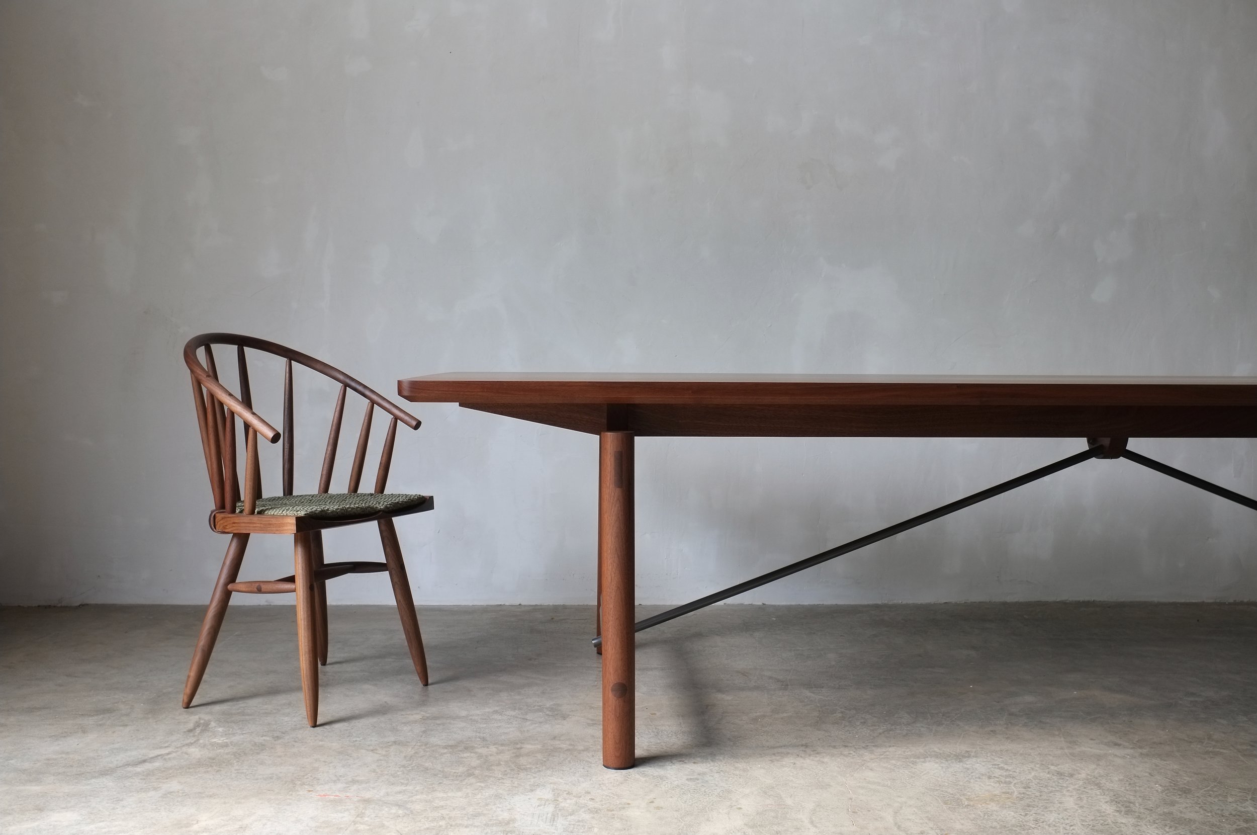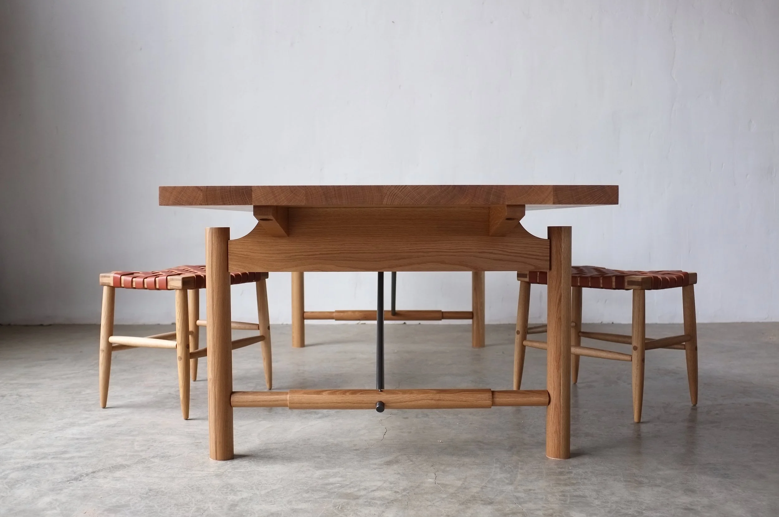 A formidable piece in our collection, the Tucket Dining Table celebrates utility and form. Metal struts provoke lightness and strength, while graceful curves converge into clean lines. An understated design that stands both calm and confident.